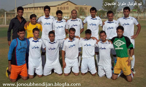 آلبوم خاطرات فوتبال هندیجان.تیم فوتبال ملوان در دهه 70 تیم فوتبال ملوان یکی از تکنیکی ترین و منظبط ترین تیمهای هندیجان در دهه 70 .این تیم که بنده افتخار حضور در آن را داشتم با بازیکنان جوان و متعصب توانست در اواسط دهه 70 نگاهها را بسوی خود جلب کند و حتی در مسابقات زیرگروه استان خوزستان سال 77 در عین شایستگی و در حالی که به یک تساوی نیاز داشت مقابل کارگر بهبهان با اشتباه فاحش داوری بازی را با نتیجه 2 بر 1 واگذار کرد و از صعود به مرحله بعد باز ماند.در این تیم که صفا و صمیمیت در آن موج میزد مرتضی محدثی به عنوان سرمربی و داریوش موسوی مقدم زحمات زیادی کشیدند.نفرات حاضر در عکس ایستاده ازسمت راست:الیاس عبادی-یونس عبادی-موسی چاروسایی-حسن اسدی-محمدذاکری-عبدالرضا قنواتی-شمس الله اسدی-شکاری-مرتضی محدثی(سرمربی) روابط عمومی باشگاه ورزشی جنوب هندیجان