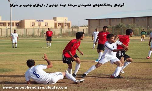 عصر روز دوشنبه بیست و ششم تیرماه از مرحله نیمه نهایی مسابقات فوتبال لیگ باشگاههای هندیجان تیمهای جنوب و ملوان به مصاف هم رفتند که تیم جنوب در یک بازی برتر با سه گل ملوان را گرفتار گرداب خود کرد و فینالیست شد.