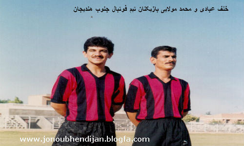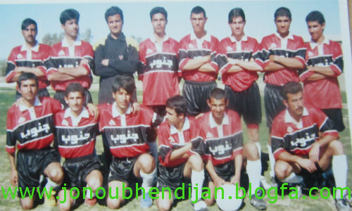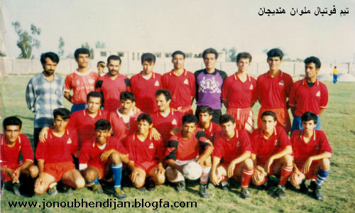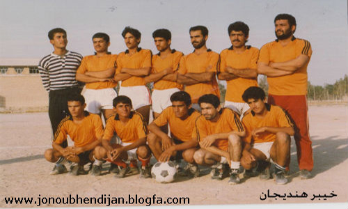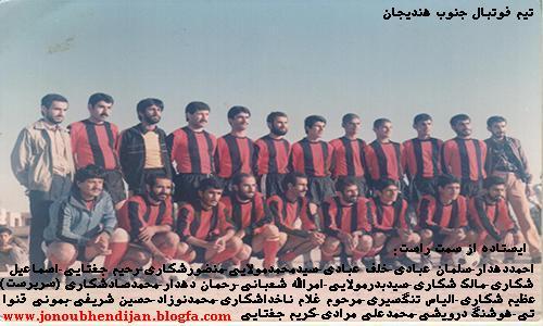 آلبوم خاطرات فوتبال هندیجان ,تیم جنوب در دهه 80 ایستاده از سمت راست:یوسف شکاری-ابراهیم عنانات-حمدالله شکاری-علی عبادی-محمود گشتیل-حسن جغتایی- عباس شعبانی-جمیل شعبانی(کاپیتان)
