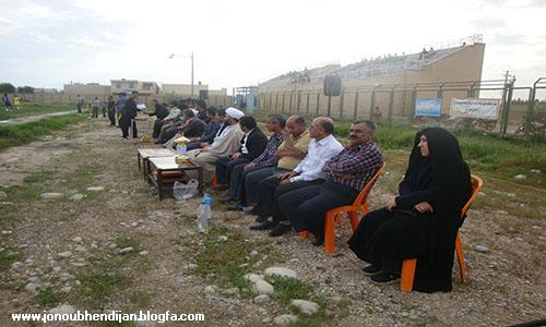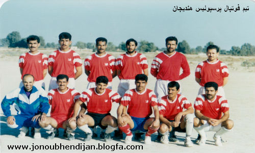 عکس تیم فوتبال پرسپولیس را در تورنمنت شهدای هندیجان نشان میدهد که در سال 70 با شرکت تیمهایی از بندردیلم-ماهشهر و امیدیه برگزار گردید. قرمزپوشان هندیجان که در ترکیب خود چند بازیکن كمكي بهمراه داشت توانست با شایستگی به مقام قهرمانی دست پیدا کند. ایستاده از سمت راست:ایرج بهبهانی-مهرداد پیرامون-جمیل شعبانی-اسماعیل جادری-حمید عبادی-سلمان عبادی نشسته از سمت راست:علی قاسم زاده-خلف عبادی-یوسف حیدری-محمدمولایی-عزیزمستطاب-داریوش قایدی